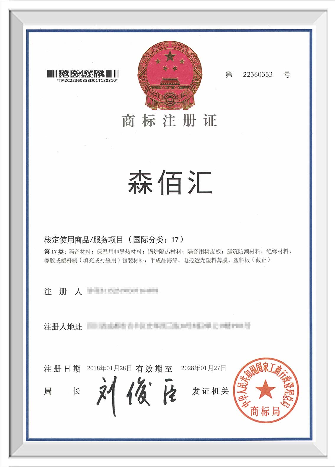 驻马店“森佰汇”商标证书下发至企业